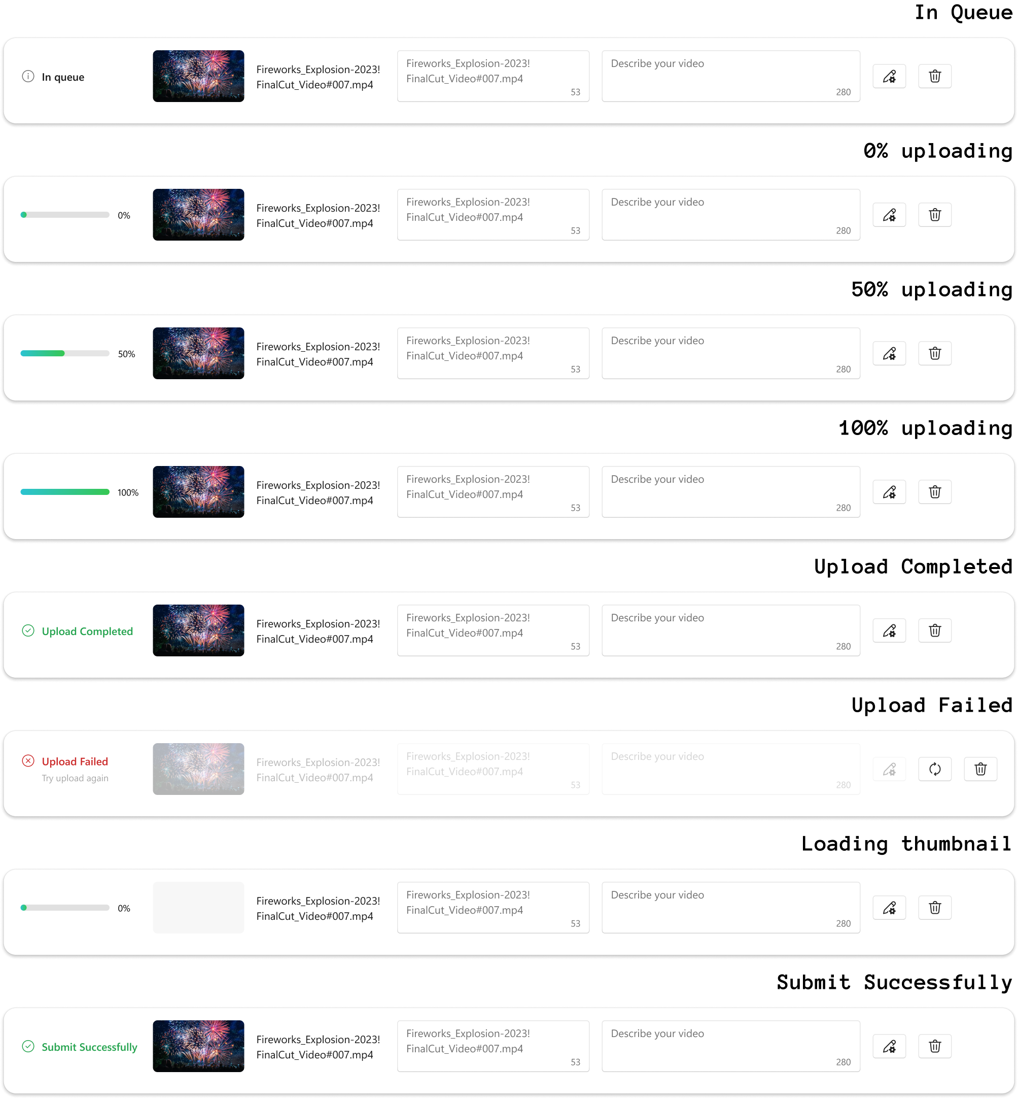 - Failed — upload or publish failed, with reason ("here's what went wrong")